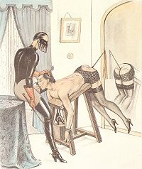 Zofe stehen, die Peitsche in der Hand, hoch aufgerichtet über einer anonymen